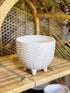 A gorgeous white glossy planter with striped pattern etchings and 4 little feet... perfect for any space that enjoys a neutral tone with a little pop of pattern.
